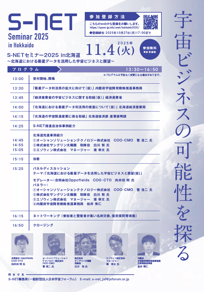 S-NETセミナー2025 in北海道は、北海道における衛星データを活用した宇宙ビジネスの可能性を探ることをテーマとしたセミナーです。当グループでは、2023年と2024年に行った牧草地におけるピンポイント除草の実証実験で、雑草の位置を特定する作業に衛星データを活用するなど、衛星データの農業利用に関する実証活動に取り組んでいます。