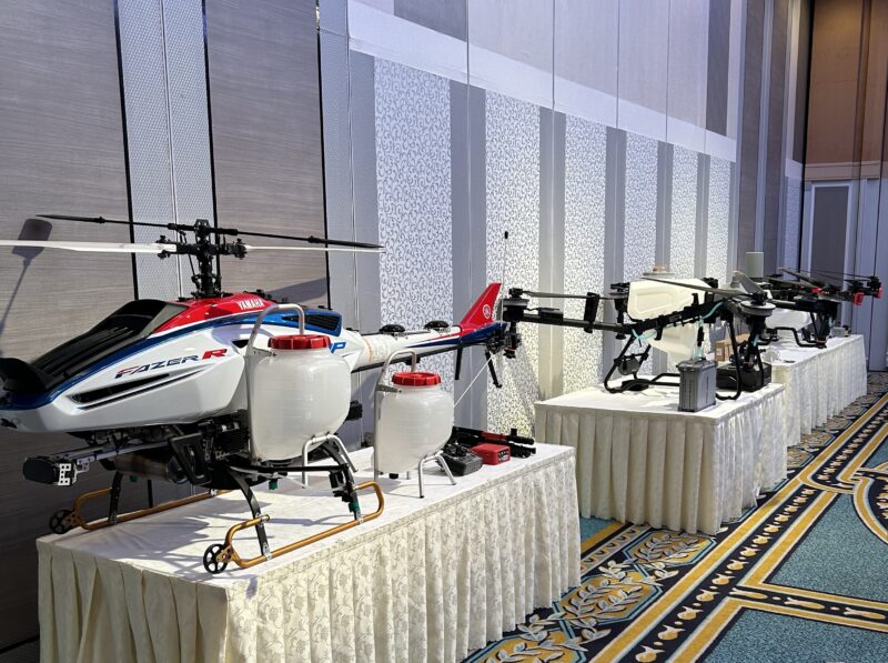 講演の最後には、北日本スカイテックからの情報提供として、最新モデルの農業用ドローンやグループ会社のサングリン太陽園が販売する種子処理機などをご紹介しました。
