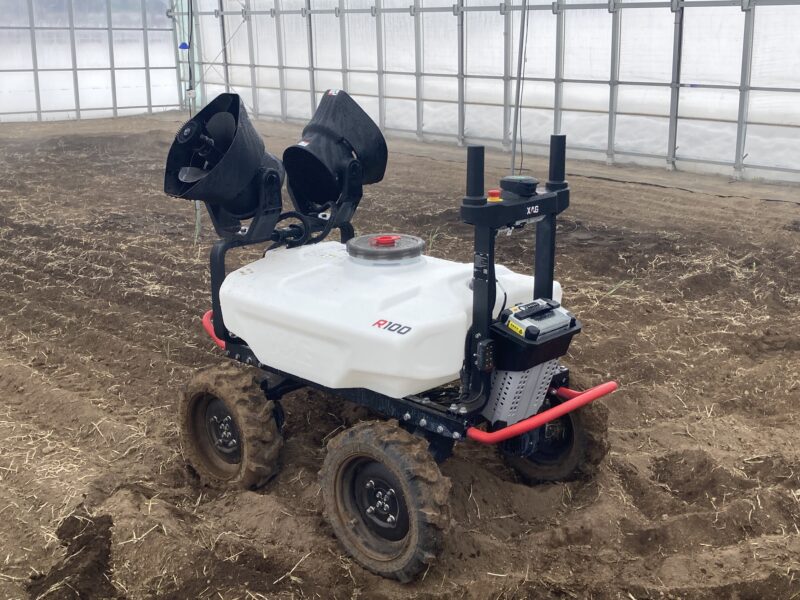 R100は、主に果樹園や畑作での活用が期待されている機体です。操縦免許が不要で、操作に慣れればすぐに圃場で運用を開始することができます。デモンストレーションでは、R100をビニールハウスの中で走らせ、コントローラーを用いたマニュアル操作や、あらかじめ設定したルートを走行する自動航行を実施。旧モデルであるR150と比べ、特に操作性や安全性が向上していることを確認しました。