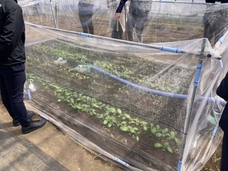 実証実験では、DAC装置に繋がるホースから送り込まれたCO₂を作物周辺に供給する区画を設定し、葉の数や長さなど生育への影響を慣行区と比較する調査を実施。大気中から回収した光合成の材料となるCO₂を効率よく活用し、生育を促す試みをすることで、CO₂を回収して終わりにしない「カーボンリサイクル」モデルの具体化を目指し、農業分野におけるCO₂有効活用の可能性を検証する取り組みとなっています。